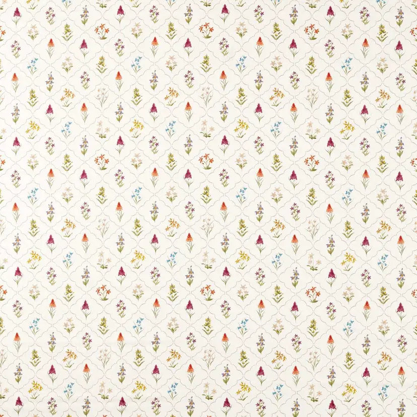 Inspired by the wildflower meadows of Brockhampton Estate, cared for by the National Trust, this mid to small-scale floral trellis design is painted in the delicate, intricate style of an Indian miniature painting. It delicately depicts Bee Orchids, Ragged Robins, Bluebells, and other native blooms, while the inclusion of Yellow Rattle reflects ongoing conservation work at Brockhampton, where sheep tread the seeds into the soil to encourage biodiversity.