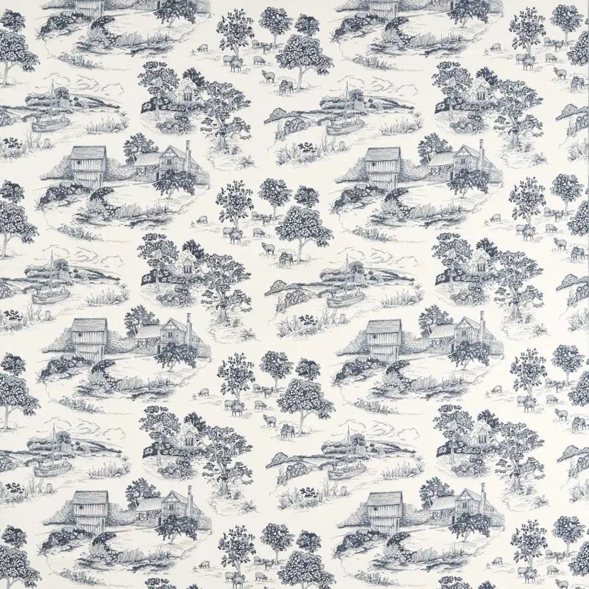 Hand-drawn in the studio, the Brockhampton Estate jacquard takes inspiration from archival toile documents to depict scenes from the estate and its surrounding landscape. The design features the 'Hereford Bull' trow boat, once used to carry fruit and cider down the Rivers Severn and Wye, alongside the timber-framed manor house and its gatehouse, dating to the late 14th century. Herefordshire sheep also appear, a nod to the estate's traditional farming practices, where they help tread wildflower seeds into the soil to encourage growth.