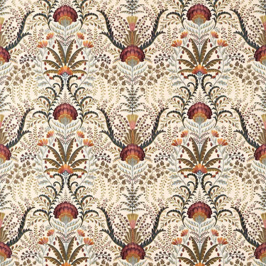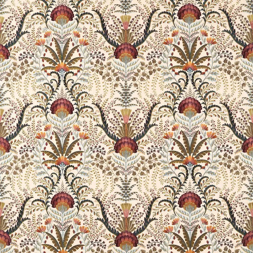 Unfurling and growing, with Marrienne, leaves fan outwards, while carnations and poppies bloom in this joyful display of nature, shaped into the damask style. Intricate, varied embroidery techniques come together to complete this highly detailed full-coverage embroidery, named after a lady who worked with her husband as tenant farmers at Brockhampton Estate.
