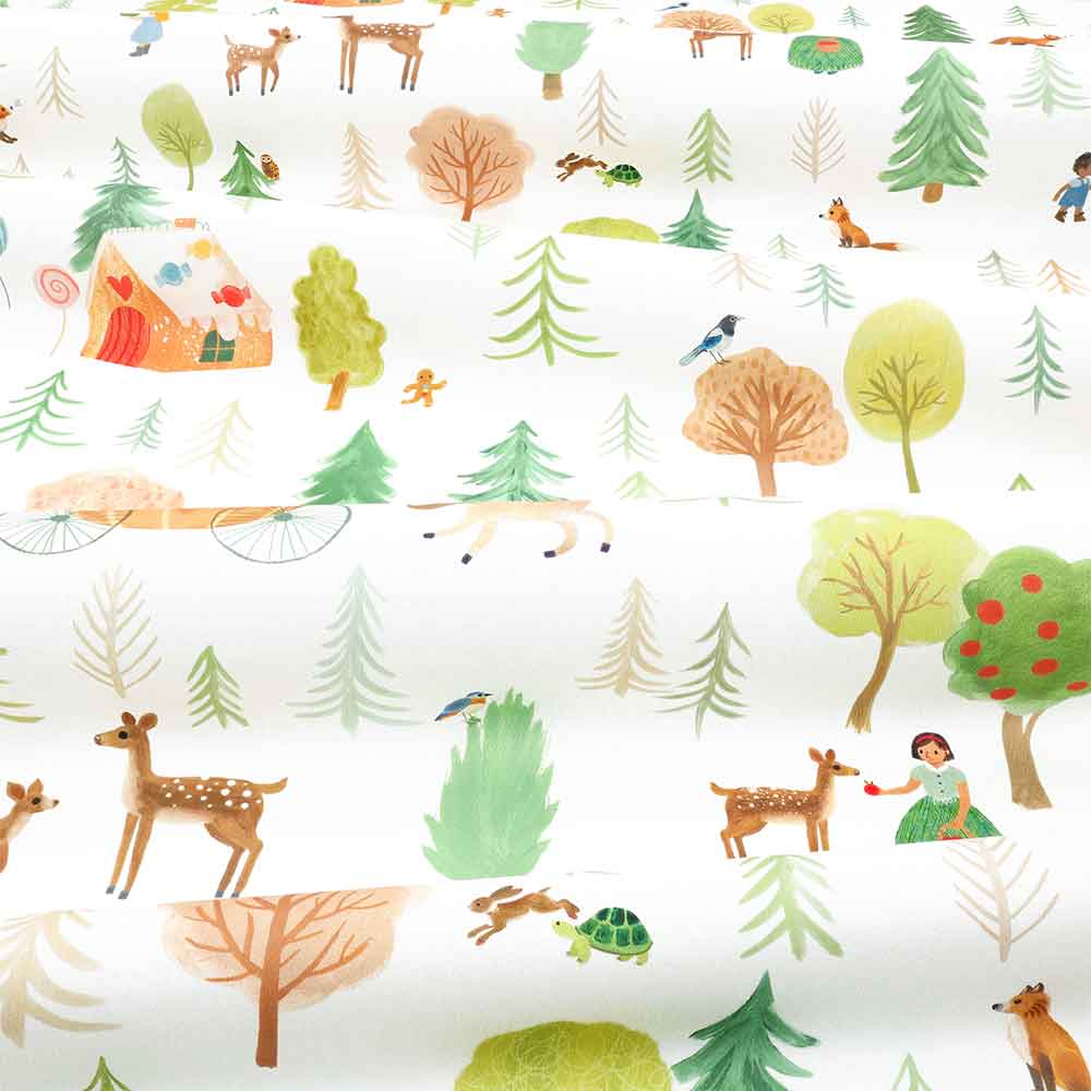 An enchanting fairytale forest printed on soft cotton; the whimsical design invites children to spot their favourite characters, blending fun with imagination.